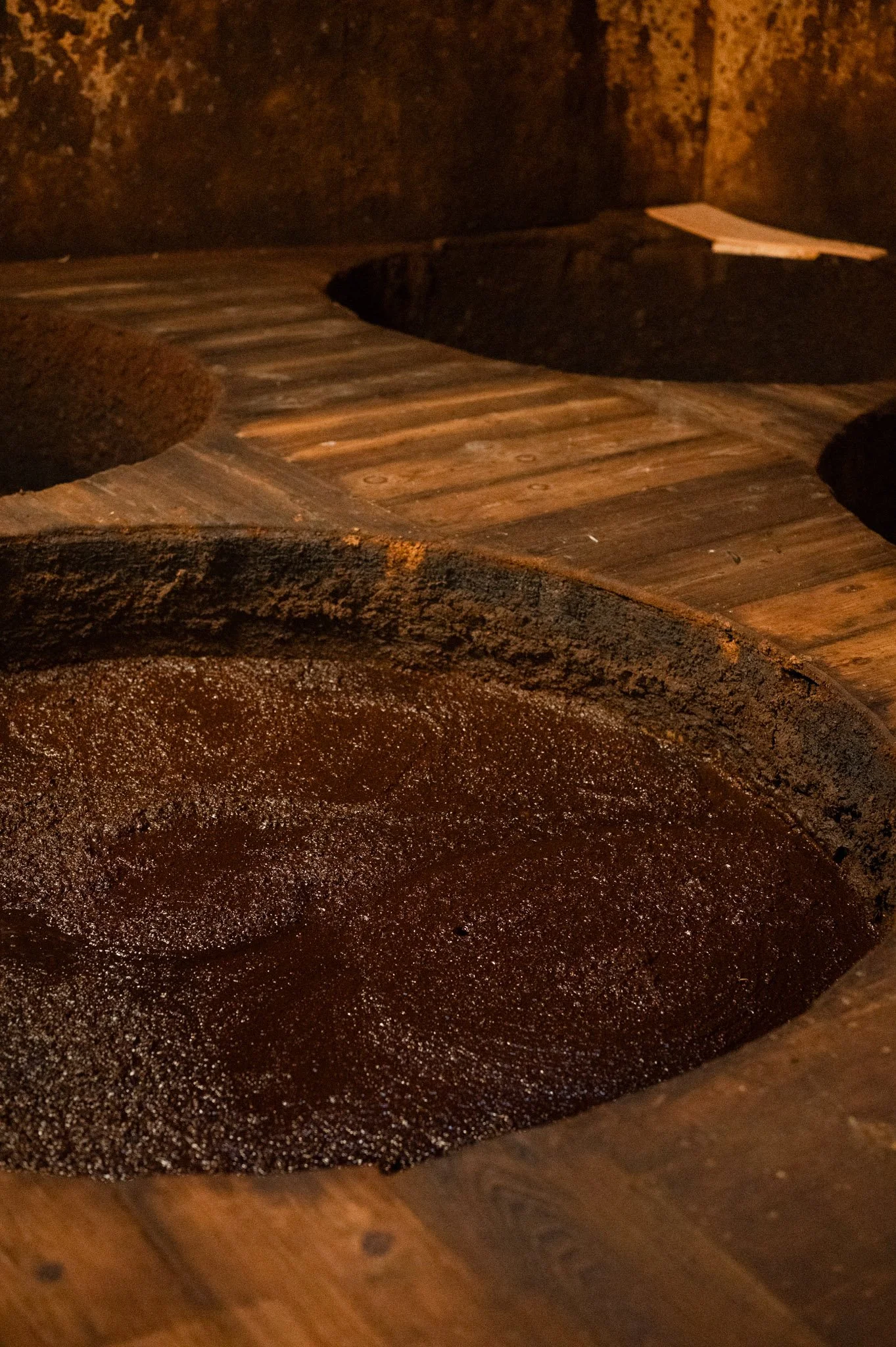 Traitement thermique : La sauce brute est doucement chauffée pendant une demi-journée dans des chaudrons en fer traditionnels chauffés au bois de pin.