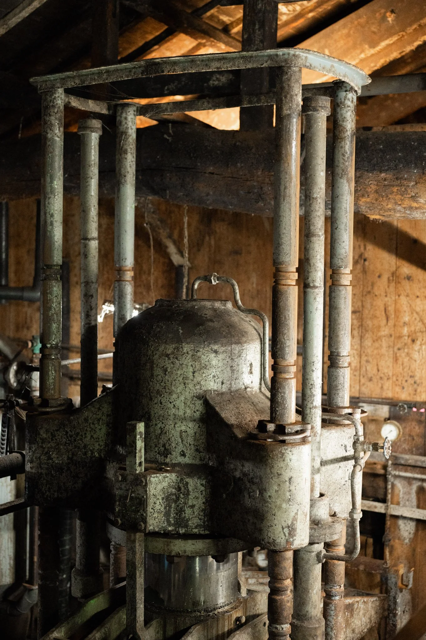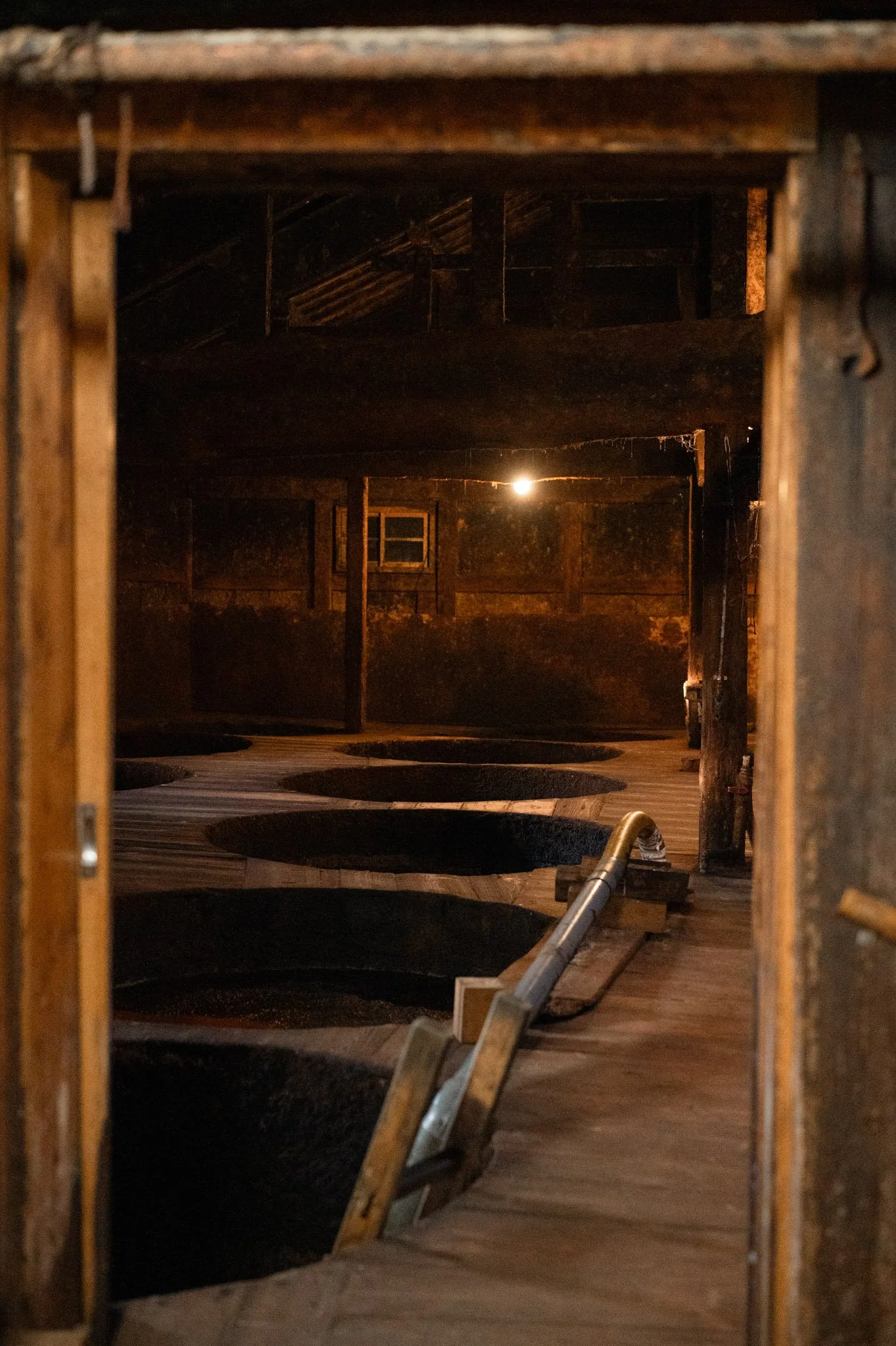 Fondée en 1841, Kadocho utilise toujours ses bâtiments d'origine et des fûts en cèdre de Yoshino vieux de 170 ans. Les plafonds, les poutres et les tonneaux sont recouverts de levures naturelles essentielles à la fermentation, appelées levures kuratsuki. Cet écosystème vivant est le plus grand trésor de Kadocho.